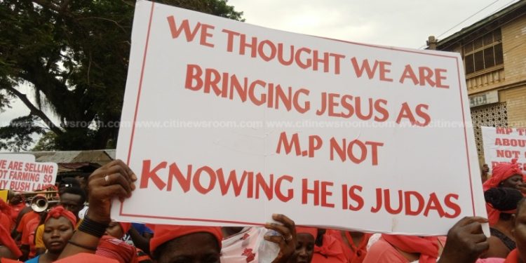 The market women clad in red apparel with placards demonstrated through the principal streets of Akim Oda on Friday to register their displeasure. They also accused the Member of Parliament for the area, Alexander AKwasi Acquah, and the assembly of doing little to help them since they lost their wares to the fire a year ago. “Where they have located us to, we don’t like it. There is nothing there. He hasn’t done anything there for us. He is lying to us,” one trader said.
