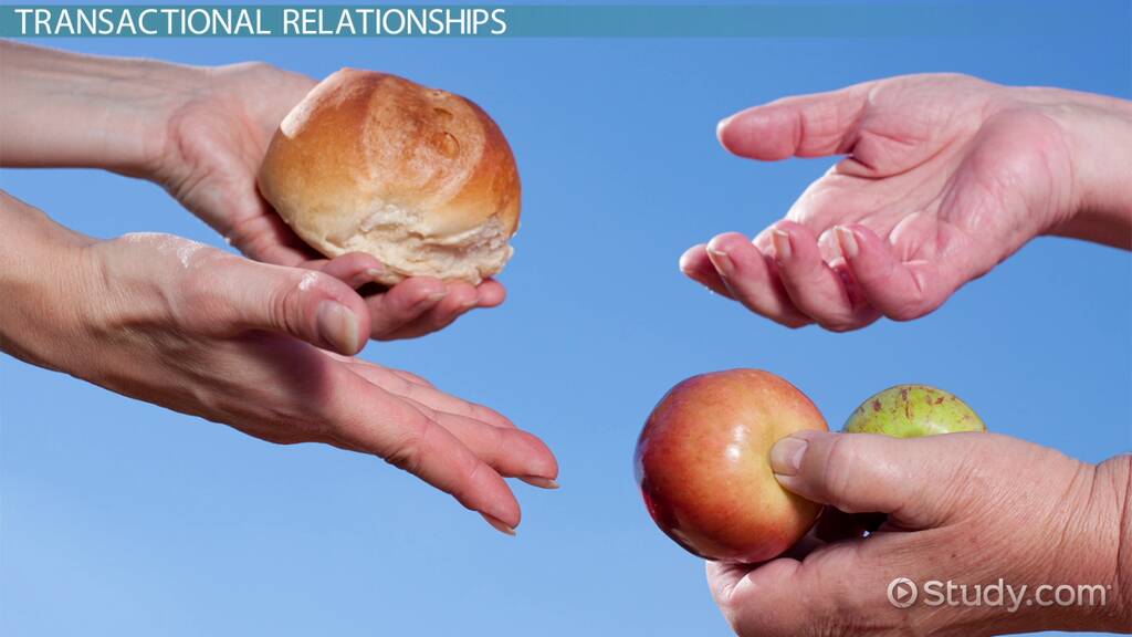 Kind of like someone brings home the bacon, and the other partner cooks it, sets the table, and wash the dishes, while the breadwinner watches football. Traditional gender roles are excellent examples of transactional relationships.