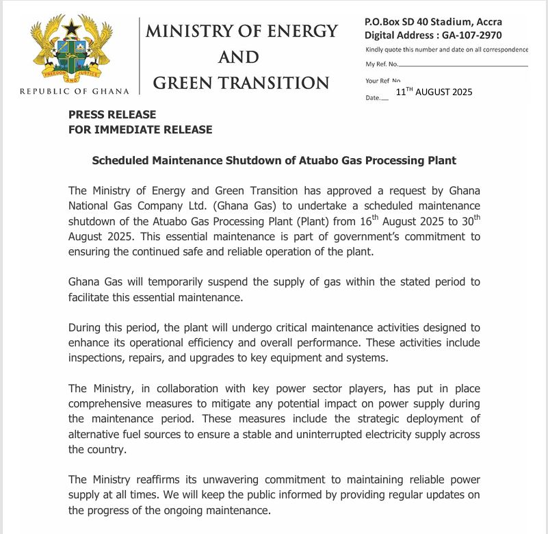 The Ministry of Energy and Green Transition has announced a two-week shutdown of the Atuabo Gas Processing Plant in the Western Region for scheduled maintenance, aimed at boosting efficiency and ensuring long-term operational safety. In a statement issued on Monday, August 11, the Ministry said the shutdown, requested by the Ghana National Gas Company Ltd., will take place from August 16 to August 30, 2025. During the period, gas supply from the facility will be suspended to allow for comprehensive inspections, repairs, and upgrades to critical systems.
