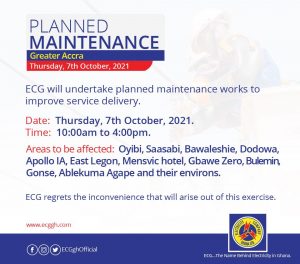 Some parts of Accra are expected to experience power outages from today, October 5 to December 5, 2021.
