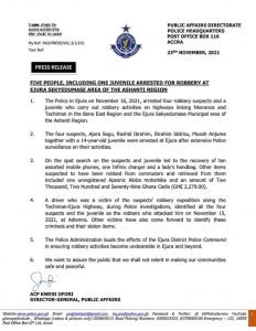 According to the press statement, the suspects were arrested on Tuesday, November 16, 2021. “The Police in Ejura on November 16, 2021, arrested four robbery suspects and a juvenile who carry out robbery activities on highways linking Nkoranza and Techiman in the Bono East Region and the Ejura Sekyedumase Municipal area of the Ashanti Region.”