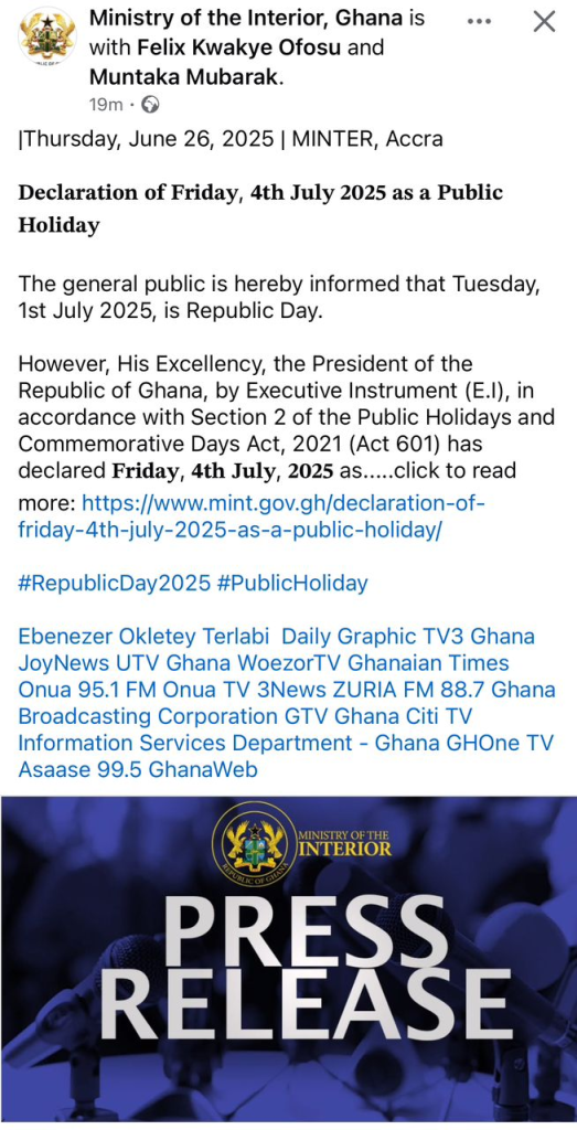 The Ministry of the Interior has announced that Friday, July 4, 2025, will be a public holiday. This information was provided in a press release issued on June 26. The general public is informed that Tuesday, July 1, 2025, is Republic Day. However, His Excellency the President of the Republic of Ghana has declared Friday, July 4, 2025, as a public holiday through an Executive Instrument (E.I.), in accordance with Section 2 of the Public Holidays and Commemorative Days Act, 2021 (Act 601).