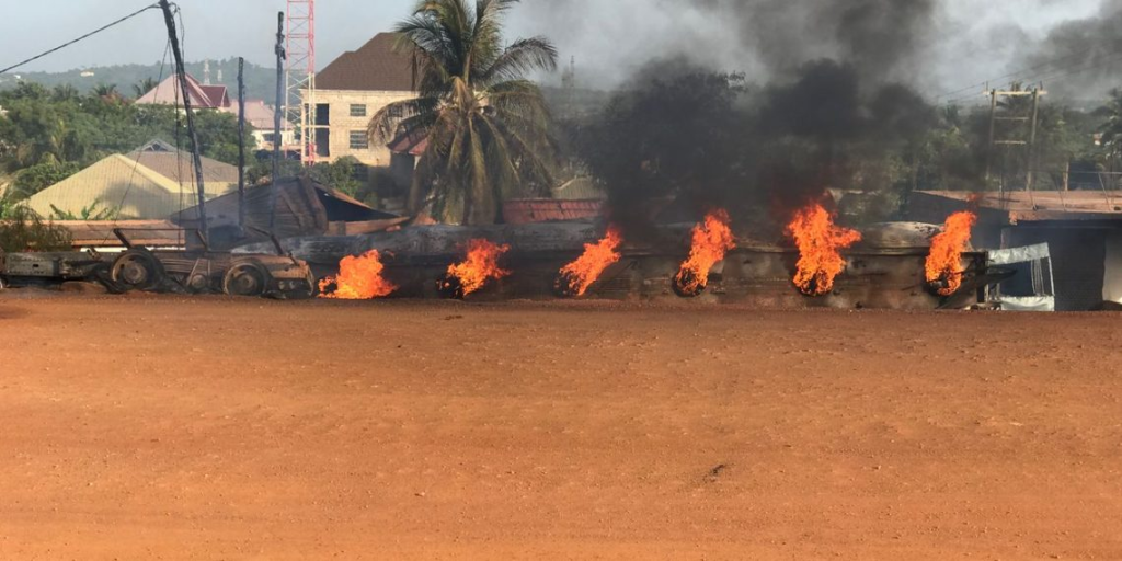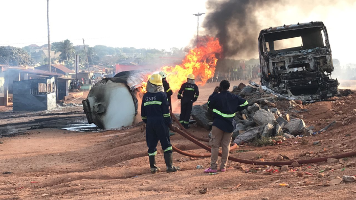 A fuel tanker overturned and exploded at Potsin Junction along the Kasoa–Winneba Highway in the early hours of Tuesday, March 17, 2026. The vehicle reportedly fell onto its side, spilling fuel that quickly ignited and spread flames to a nearby house. Eyewitnesses described how the fire rapidly engulfed the surrounding area, heightening fears for residents’ safety.