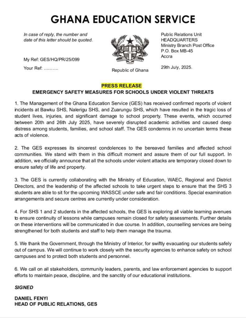 The Ghana Education Service (GES) has announced the temporary closure of schools affected by recent violent incidents in the Upper East Region. The schools, including Bawku SHS, Nalerigu SHS, and Zuarungu SHS, experienced tragic events that claimed student lives, caused injuries, and led to significant property damage. The violent attacks, which took place between July 20 and 26, have deeply disrupted academic activities and left students, families, and staff distressed.