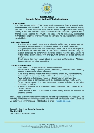 According to the Authority, cybercriminals typically create fake social media accounts using attractive profile images to lure unsuspecting individuals into romantic or flirtatious interactions. Once trust is established, the perpetrators coerce their targets into sharing intimate content or participating in explicit video calls, which are secretly recorded without consent. “These materials are then used to extort money from victims, who are threatened with public exposure unless they pay a ransom—usually through mobile money transfers,” the CSA noted.