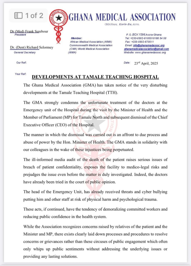 The Ghana Medical Association (GMA) has strongly criticised recent developments at the Tamale Teaching Hospital (TTH), describing the treatment of medical staff and the dismissal of the hospital’s Chief Executive Officer (CEO) as unjust and an abuse of power. In a statement issued on Wednesday, April 23, the GMA condemned the actions of the Minister of Health, Kwabena Mintah Akandoh, during a recent visit to the hospital, calling the CEO’s dismissal “an affront to due process.”