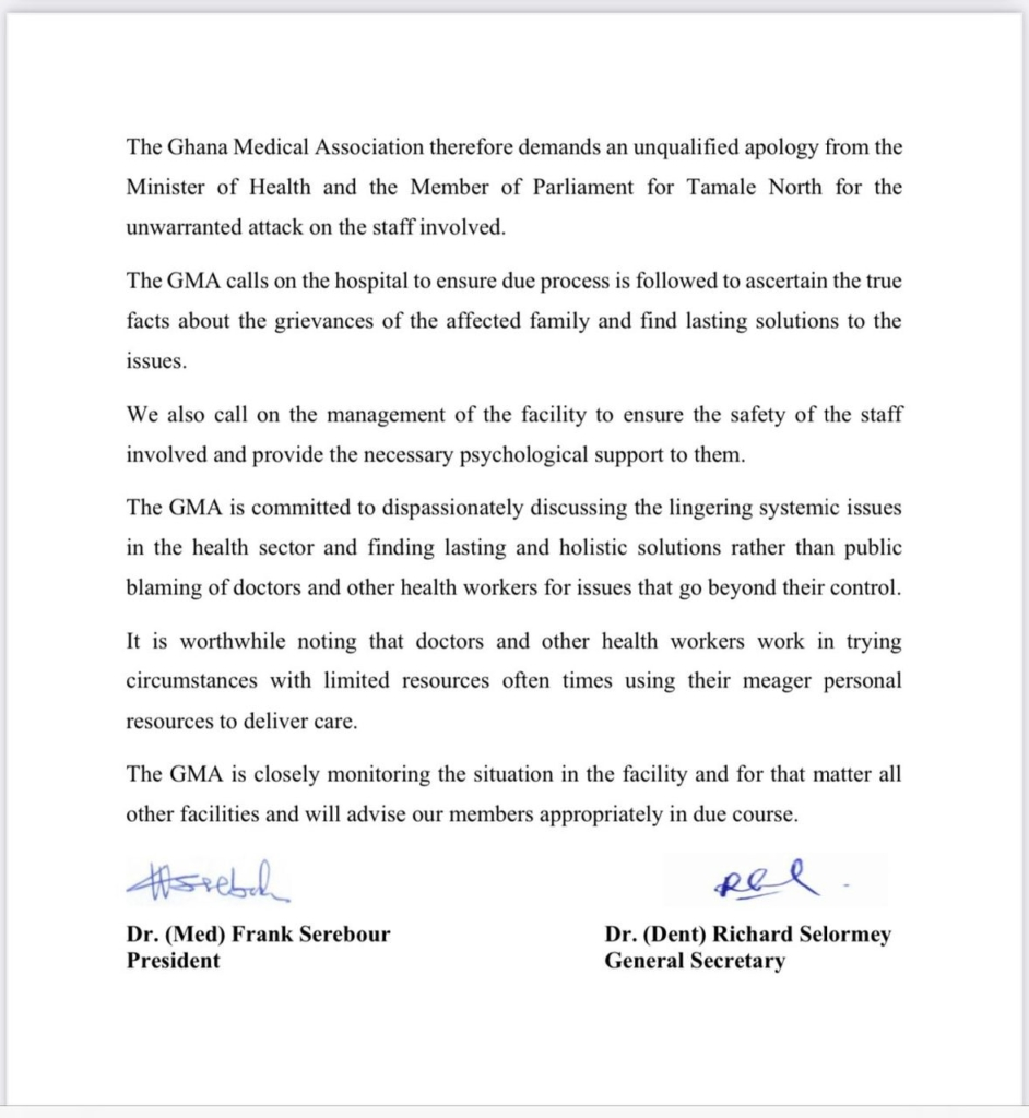 The GMA demanded an unqualified apology from the Minister of Health and the Tamale North MP for what it described as “unwarranted attacks” on the hospital staff.