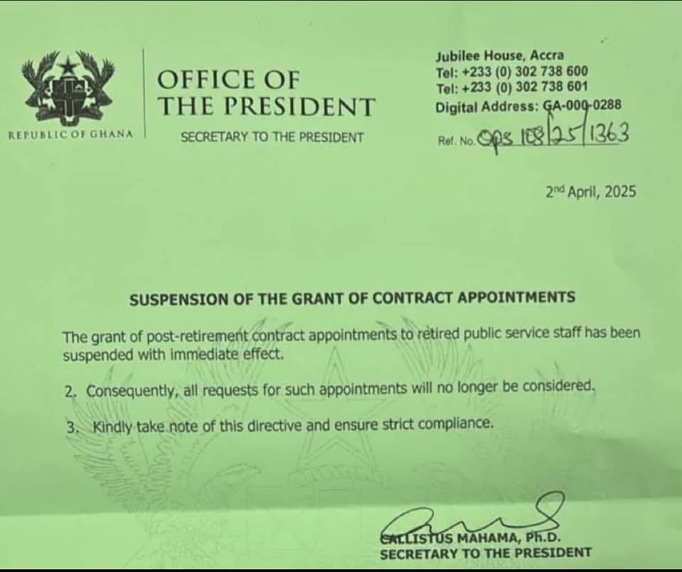 The Office of the President has issued a directive suspending the grant of contract appointments to retired public service staff with immediate effect. In a letter dated 2nd April 2025 and signed by Dr. Callistus Mahama, Secretary to the President, the presidency announced that all post-retirement contract appointments are to be put on hold.