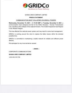 “At 15:40 GMT on Tuesday, November 9 2021, a communication mast collapsed and fell on the 330kV Aboadze-Kumasi transmission line, resulting in the collapse of two adjacent towers. The incident happened near Bogoso in the Western Region.”