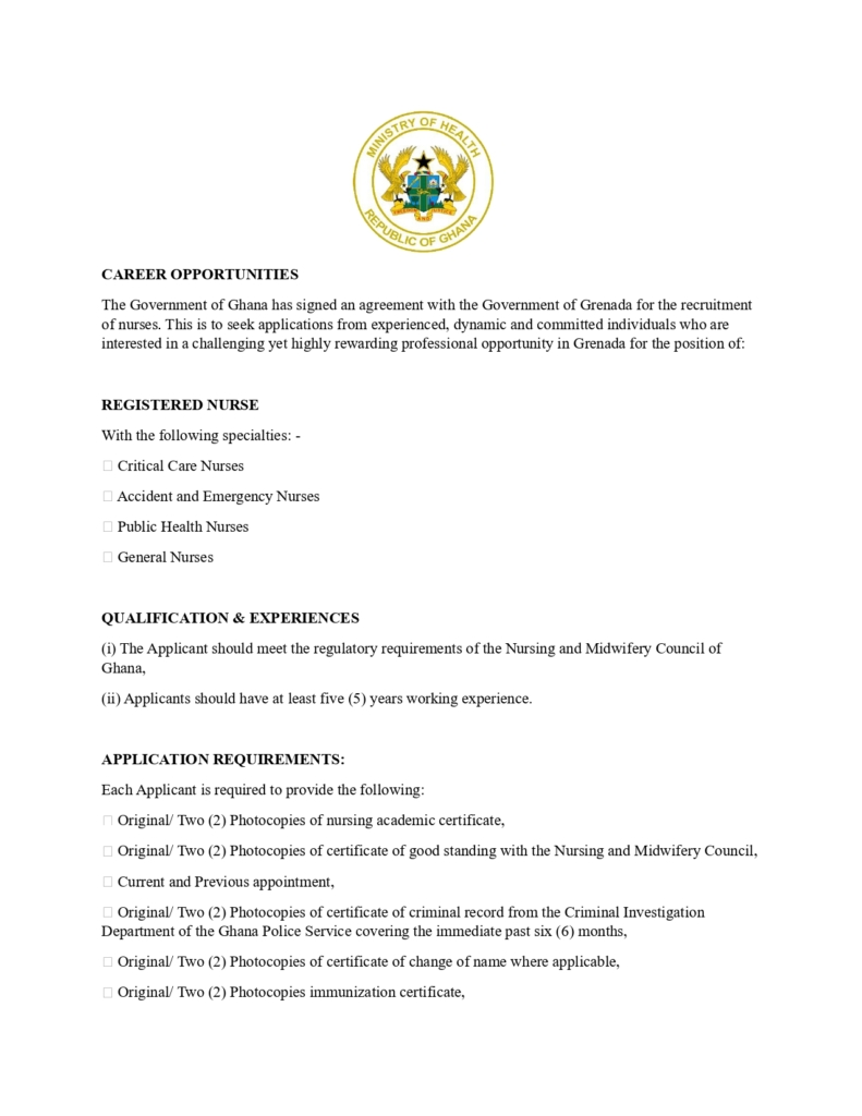 The Ministry of Health has announced that applications are now open for Ghanaian nurses to be recruited for work in Grenada, as part of a bilateral agreement between the governments of Ghana and Grenada. The Ministry is inviting experienced and qualified Registered Nurses from various specialities, such as Critical Care, Accident and Emergency, Public Health, and General Nursing, to apply.