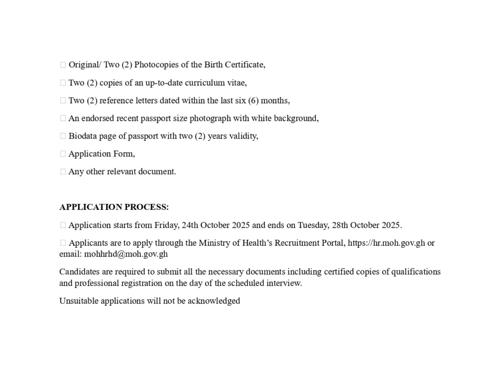 It also said certified copies of all qualifications and professional documents must be presented during the scheduled interview. The application process begins on Friday, October 24, 2025, and closes on Tuesday, October 28, 2025. Interested candidates are to apply through the Ministry of Health’s online recruitment portal. The Ministry noted that only suitable applicants will be contacted.