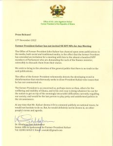 “The Office of Former President John Kufuor has chanced upon some publications in the media, both social and traditional media, to the effect that the former President has extended an invitation for a meeting with him to the almost a hundred NPP members of Parliament who are demanding the sack of the finance minister, ostensibly to dissuade them from their stance.