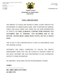 According to the Department of Urban Roads’ Acting Director, Ing. James Amoo-Gottfried, the decision is necessary due to the construction of a new bridge over the Kpeshie Lagoon.