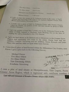 A purported copy of the will of the late Sir John has been widely shared on social media which claims ownership of a piece of land in the Achimota Forest in the name of the company called DML limited.