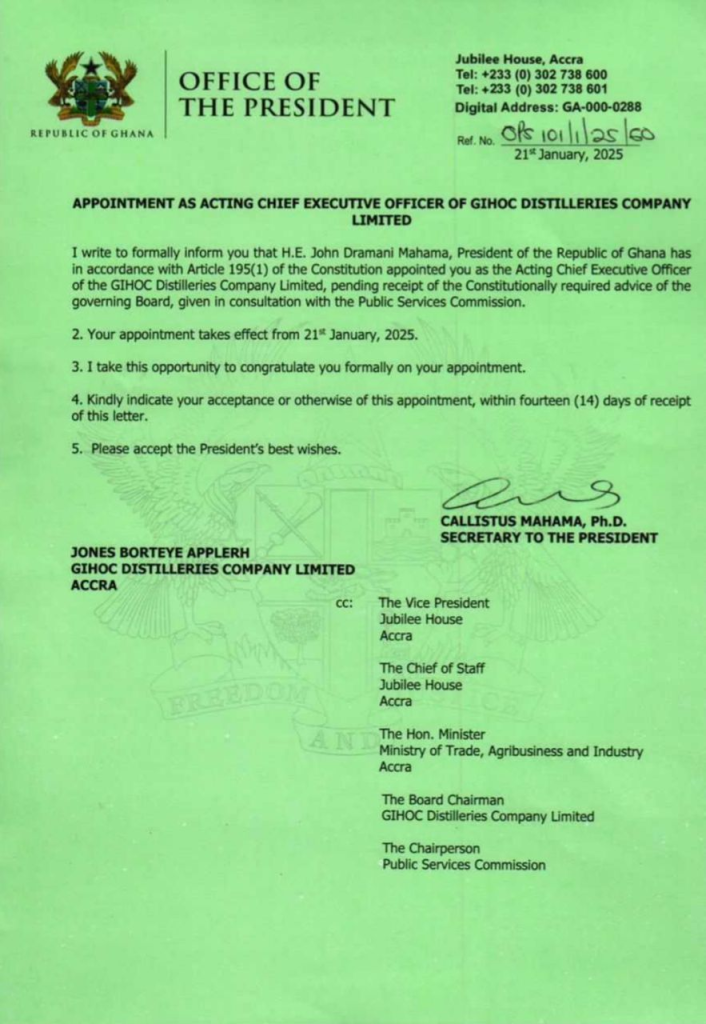 President John Dramani Mahama has appointed Jones Borteye Applerh, a former Executive Secretary of the Small Arms Commission, as the acting Chief Executive Officer of GIHOC Distilleries. His appointment is subject to receiving the constitutionally required advice from the Governing Board, in consultation with the Public Services Commission.