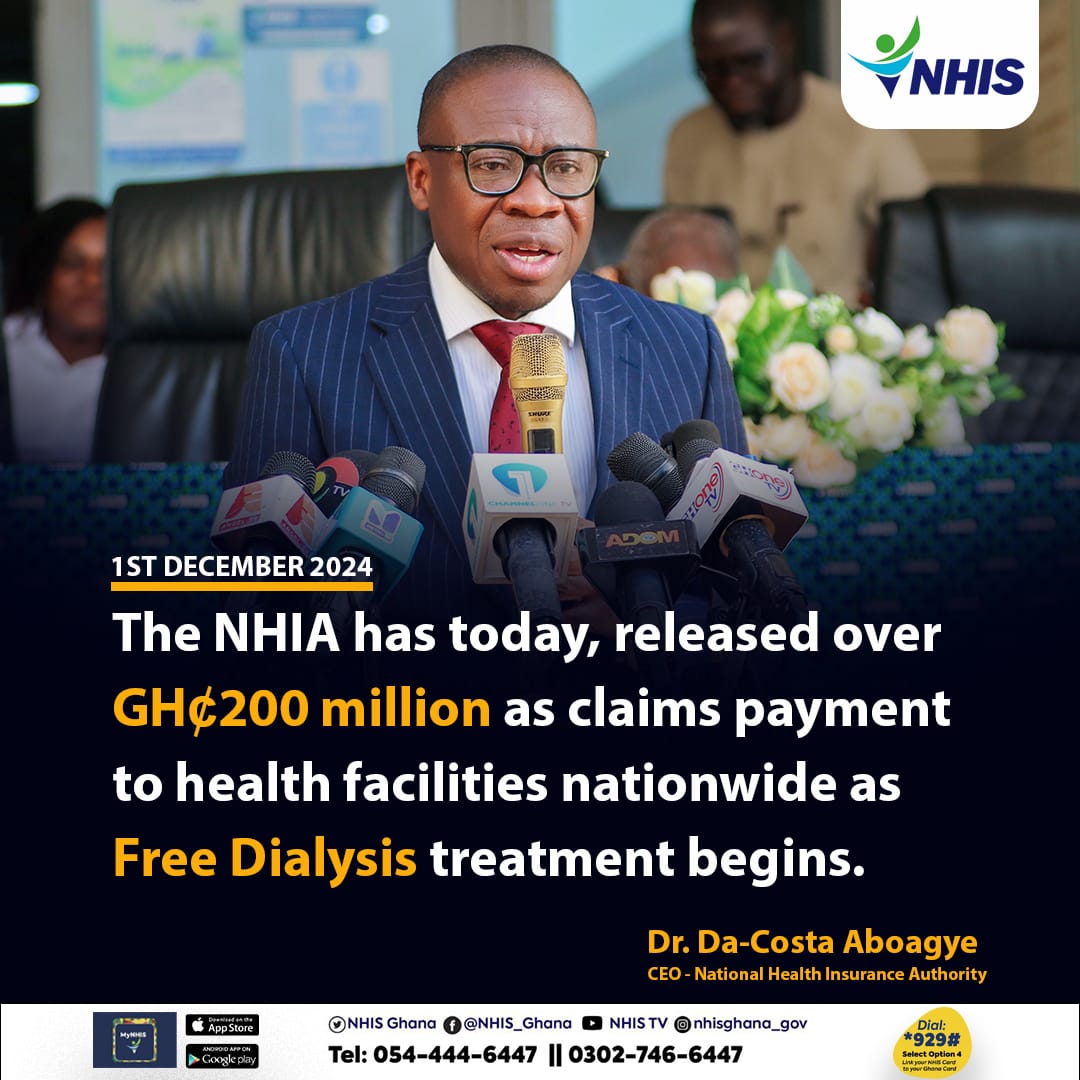 NHIA Chief Executive Officer, Dr. Da-Costa Aboagye, announced, “The NHIA has today [Sunday] released over GHS200 million as claims payment to healthcare facilities nationwide as free dialysis treatment begins.” This initiative follows the NHIS’s announcement on November 30, 2024, of accredited health facilities set to provide free dialysis treatment across Ghana, effective December 1, 2024.