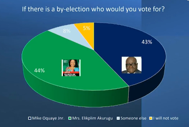 Mr Dankwa said their research had shown that the National Democratic Congress (NDC) candidate rather stands a chance of winning in a by-election as 43% of the constituents were willing to vote for Mike Ocquaye in a by-election as compared to 44% for the NDC’s Elikplim Akurugu.