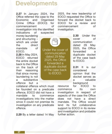 However, in a twist, EOCO returned the entire docket to the OSP in May 2024. EOCO’s reasoning was that “since money laundering is not a substantive offence but a collateral offence which must be founded on a predicate offence, EOCO did not have a mandate to commence investigations into the matter since it could not premise its investigation on any predicate offence.”