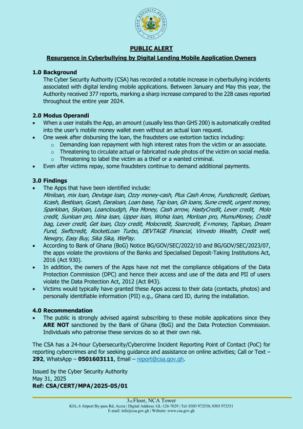 The Cyber Security Authority (CSA) has raised concerns about a rising wave of cyberbullying associated with unregulated digital lending apps. This year has seen a significant increase in complaints. Between January and May 2025, the CSA received 377 reports of abuse, compared to 228 cases recorded in 2024. The CSA attributes this surge to the aggressive and exploitative tactics used by various mobile loan applications that operate outside legal and regulatory frameworks. These platforms often push unsolicited microloans on users and resort to harassment and intimidation to recover payments.
