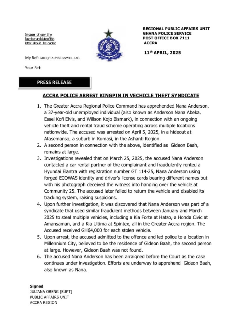 The police stated that further investigations uncovered Anderson’s involvement in a broader criminal syndicate responsible for the theft of multiple vehicles between January and March 2025. The statement indicated that the syndicate employed similar fraudulent methods to steal a Kia Forte at Haatso, a Honda Civic at Amasaman, and a Kia Ultima at Spintex, all within the Greater Accra Region.