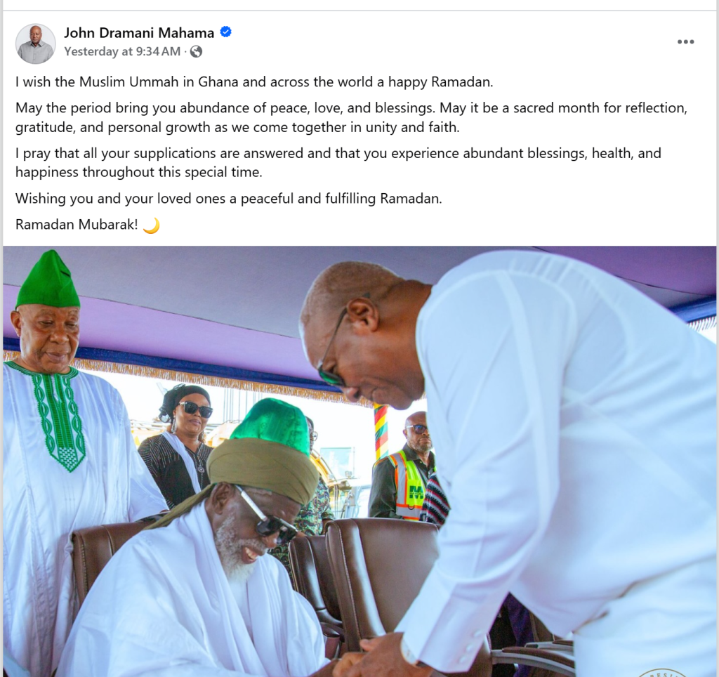 “I pray that all your supplications are answered and that you experience abundant blessings, health, and happiness throughout this special time,” Mahama added in his post on Facebook. Concluding his message, he wished all Muslims a peaceful and fulfilling Ramadan, saying, “Ramadan Mubarak!”