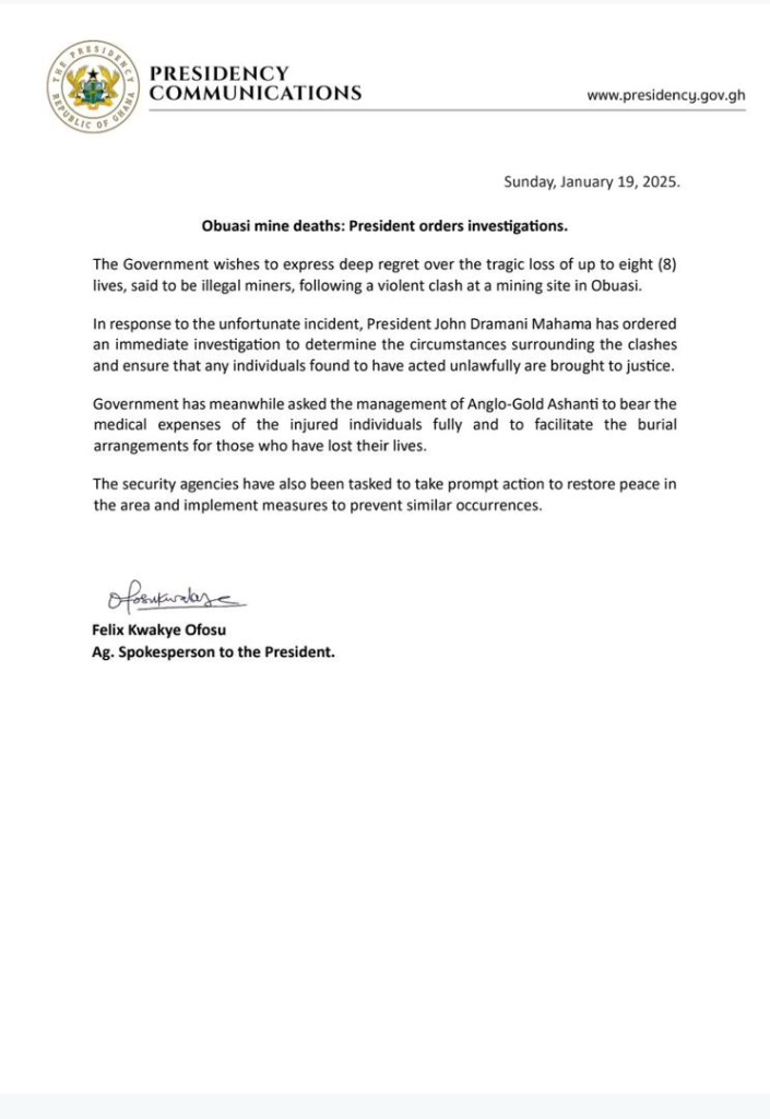 “The Government wishes to express deep regret over the tragic loss of up to eight (8) lives, said to be illegal miners, following a violent clash at a mining site in Obuasi. “In response to the unfortunate incident, President John Dramani Mahama has ordered an immediate investigation to determine the circumstances surrounding the clashes and ensure that any individuals found to have acted unlawfully are brought to justice.”