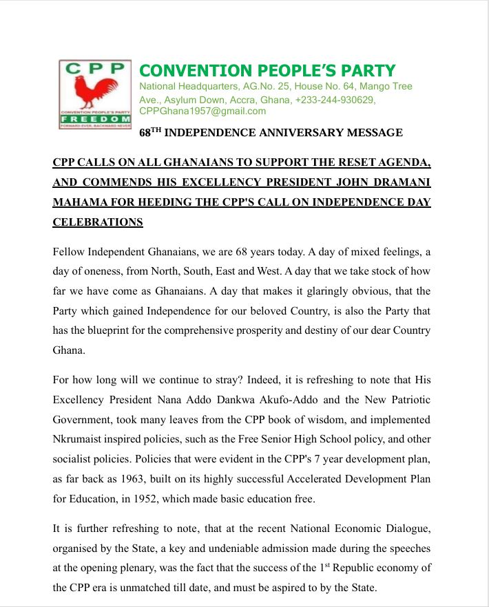 In a statement issued on Thursday, March 6, the CPP commended the president for his decision to scale down the 68th Independence Anniversary Commemoration, saving the nation GHS13.5 million an amount they stated represents 90% of the previous cost.