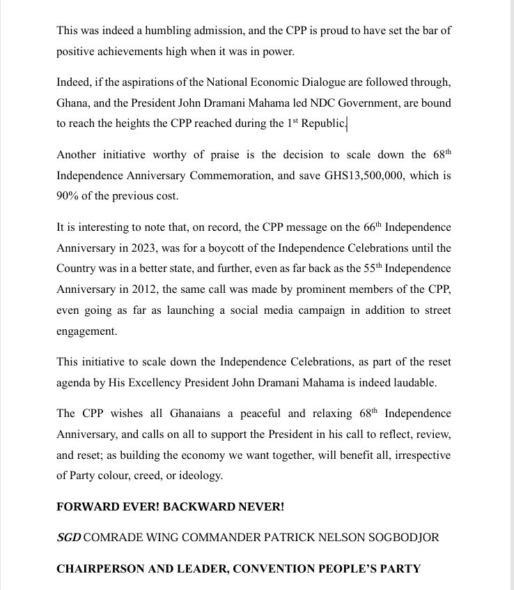 The CPP noted that during the 66th Independence Anniversary in 2023, it had called for a boycott of Independence Day celebrations until the country was in a better state. The party added that even as far back as the 55th Independence Anniversary in 2012, prominent CPP members had made similar calls, launching both social media campaigns and street engagements to advocate for change.