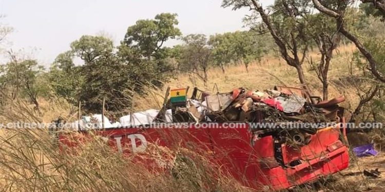Nine persons including a toddler, have been confirmed dead in an accident at Gindabuo in the Sawla-Tuna-Kalba District of the Savannah Region. According to the police, the driver of the Wa bound bus with registration number, GT 5693-15 allegedly lost control over the steering wheel and veered off the road.