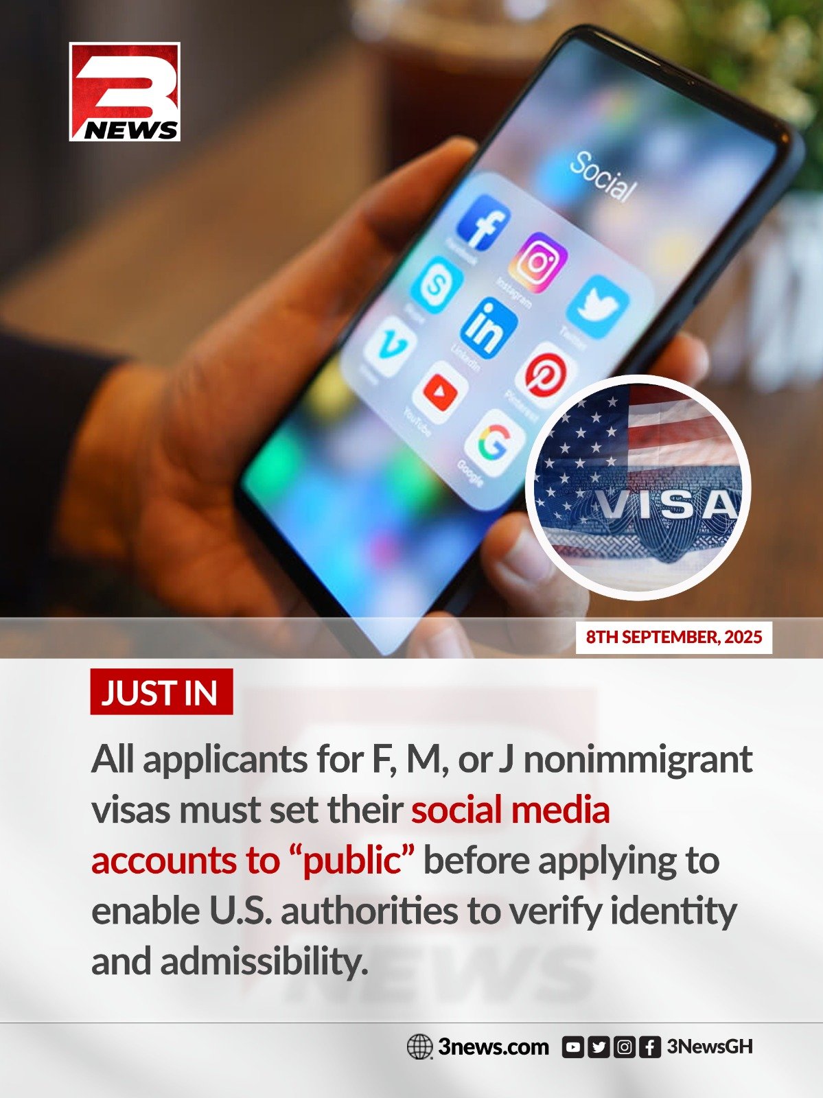 Effective immediately, individuals applying for F, M, or J visas must also adjust the privacy settings on their social media accounts to “public” in order to facilitate vetting. The U.S. government explained that this measure is necessary “to establish their identity and admissibility to the United States under U.S. law.”