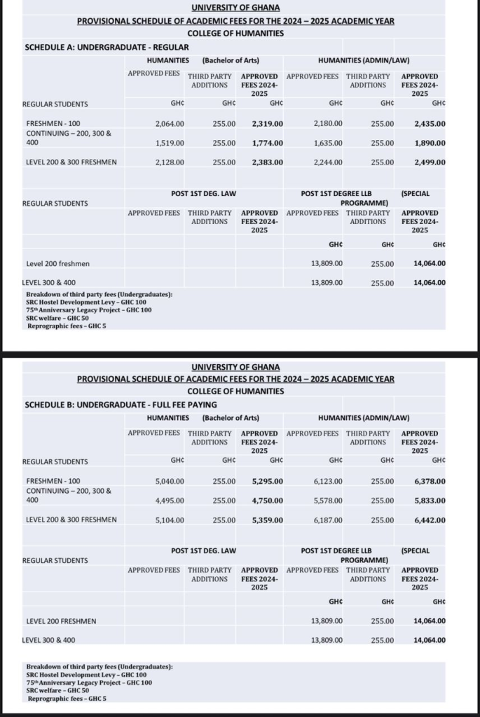 Similarly, at the University of Ghana School of Law, undergraduate freshers under the College of Humanities will pay GH¢3,226, a 33 percent increase from GH¢2,435 last academic year. Continuing law students will also see their fees rise from GH¢1,890 to GH¢2,396.