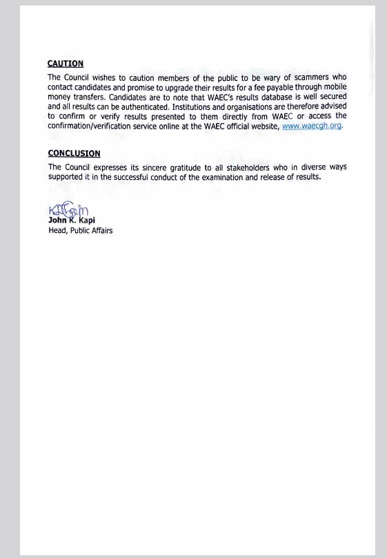 WAEC cautions the public to be wary of scammers who promise to upgrade examination results for a fee. The Council assures that its results database is secure, and all results can be authenticated. Institutions and organizations are encouraged to verify results directly from WAEC or use the online verification service at [www.waecgh.org](www.waecgh.org). WAEC expresses its sincere gratitude to all stakeholders who supported the successful conduct of the examination and the release of results.