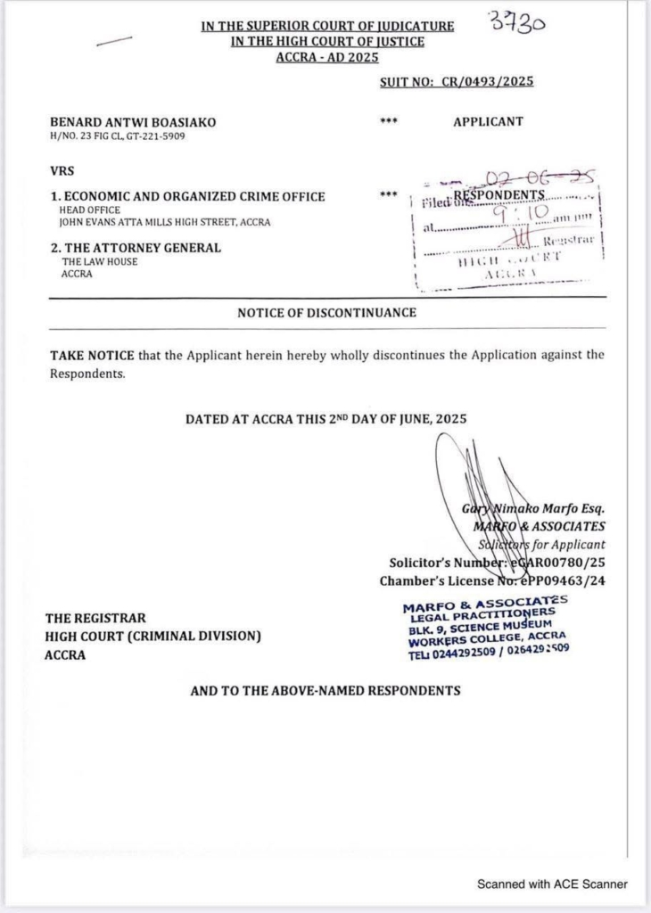The application to withdraw was filed by private legal practitioner Gary Nimako on behalf of the embattled NPP regional chairman. Meanwhile, lead counsel Andy Appiah-Kubi has confirmed that all the necessary documentation for the two justified sureties has now been completed. He noted that this progress, which has rendered the court application unnecessary, was made possible with considerable assistance from former Minister for Food and Agriculture, Bryan Acheampong.